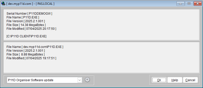 Select from the system File Help>About P11D Organiser > Software Live Update option, you can also access this routine by pressing the F2 Function Key on your keyboard.