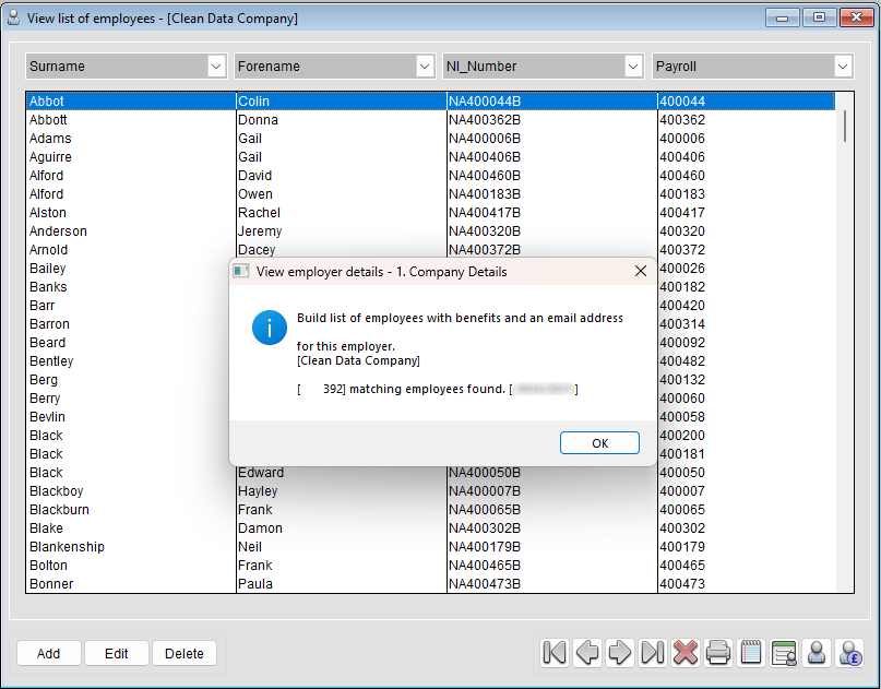 Filters can be applied for a number of criteria such as current employees, leavers, employees WITH/WITHOUT email addresses etc so as to exactly define a lookup and then use this lookup to email or print reports etc top this specific batch of employees.