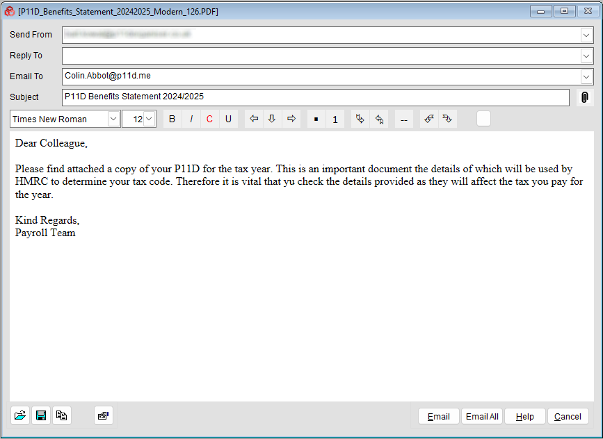 The system can be used to generate individually addressed emails, attaching a PDF version of the chosen Employees Benefits statement report. The system will send the emails to the email addresses saved in the employee records.